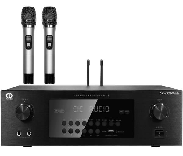 CIC Audio®-K系列AB类三合一 KTV 合并功放机(一、内置专业DSP人声处理效果器;二、内置无线麦克风接收器,含2只专业无线麦克风;三、300W x 2 大功率专业后级输出,2声道前级输出,1通道Mic输入,光纤输入,蓝牙输入)